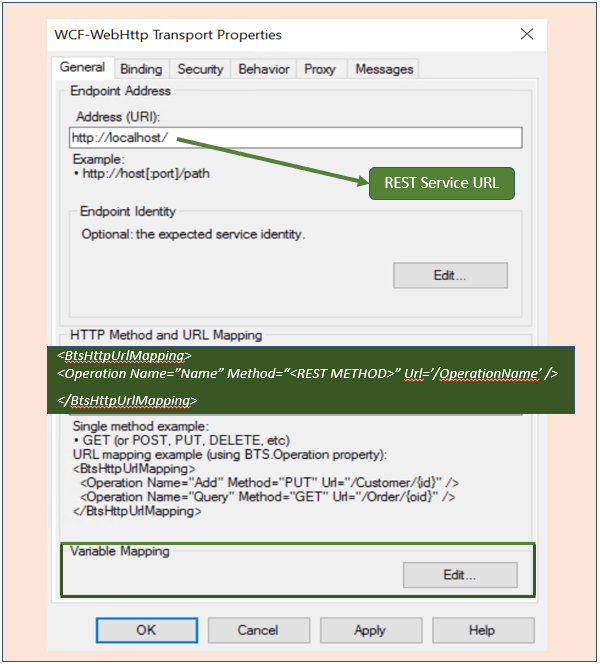 <BtsHttpUrlMapping><Operation Name=”” Method=”<REST METHOD>” Url=’/OperationName/Request’ /></BtsHttpUrlMapping>