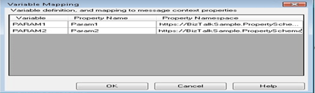 In above screen shot we are defining Variable Mapping (at Send Port). In variable Mapping, we are assigning parameters with Property Schema. We need to define Property Schema variable with Message Context Property. Otherwise it will not assign any value.