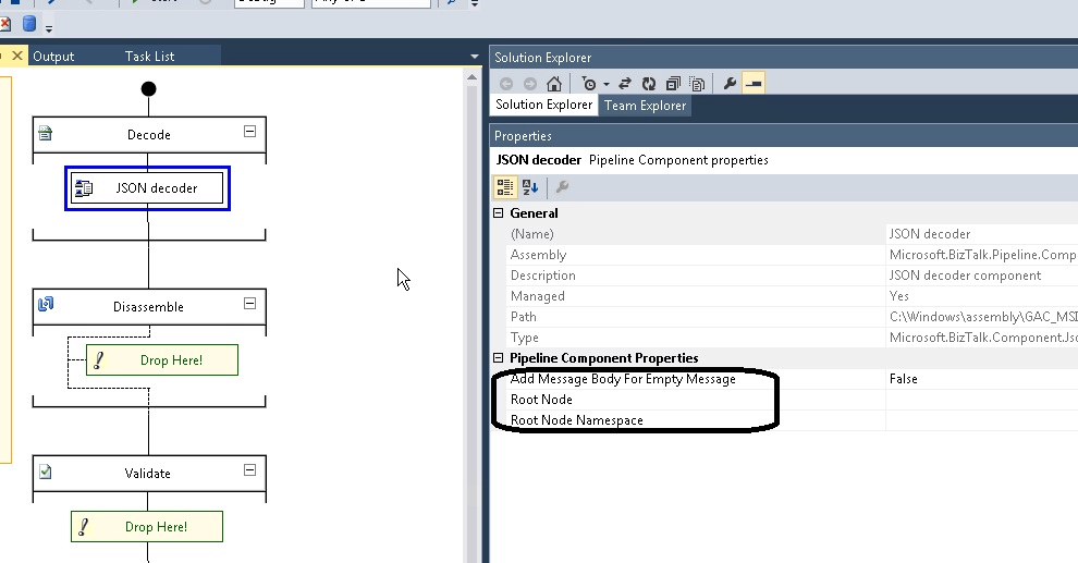 We are using JSON decoder pipeline component in Receive Pipeline to convert json to xml format. This pipeline has two properties (if you have installed above define hotfix then three properties)